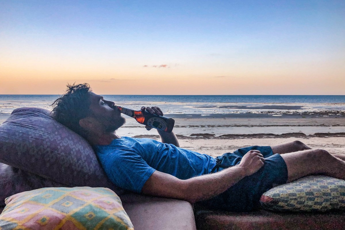 De senaste dagarna är nog egentligen veckor. Men tiden flyter ihop samtidigt som jag har flutit runt i havet. Eller i mitt eget svett. Vi har bott på fyra olika ställen för att bada i samma hav. Haft fyra olika stränder under fötterna. Men solen och värmen har varit densamma. Just nu är vi på Mahaba Beach Resort och Beatrice som bor här och driver stället tillsammans med sin man sa att havet är den enda massage hon behöver. Hon startar varje dag med ett dopp och en morgon var jag uppe lika tidigt så vi möttes där. Hon liksom sitter på knä i vattnet och låter vågorna rulla in över ryggen. Det är onekligen en fridsam massage.