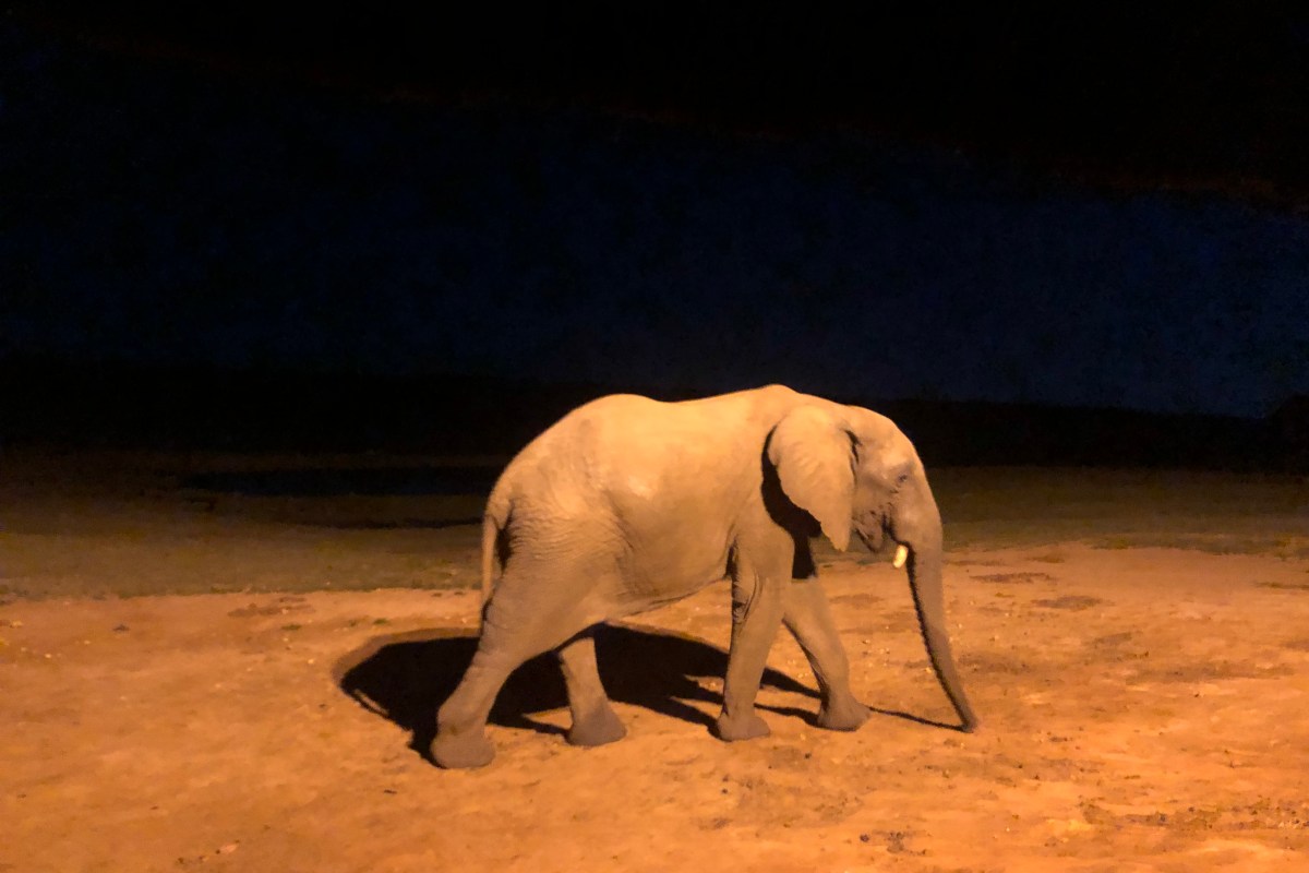 Vår andra kväll i Zimbabwe var vår första kväll öga mot öga och väldigt nära en livs levande och otroligt stor elefant. Du vet att elefanten enkelt kan krossa dig om hon vill. Du vet att elefanten kan gå därifrån och då är ögonblicket förbi. Allt är på elefantens premisser. Det enda du kan göra är att andas lugnt och våga öppna lite spjäll och dela några minuter på den här planeten med det största djuret du har sett. Och vara precis som pappa önskade. Lycklig.
